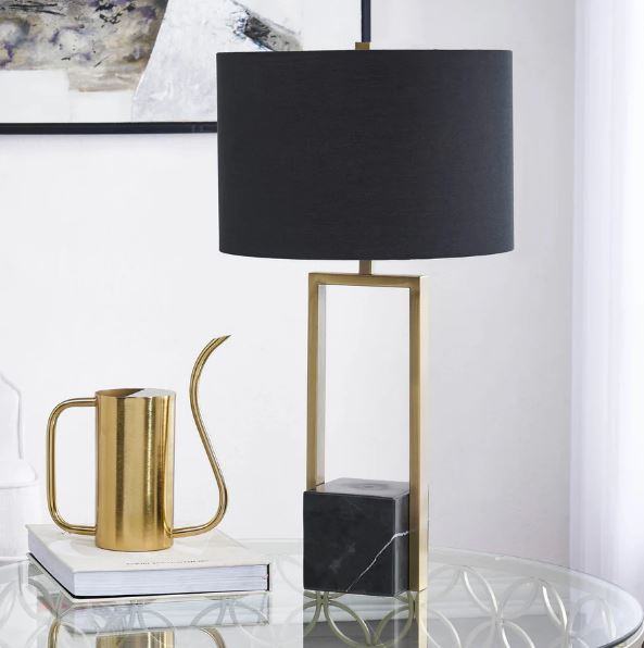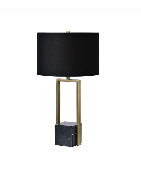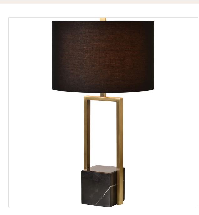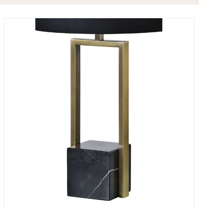 Cette lampe de table Arla incarne l'élégance contemporaine avec ses lignes épurées et sa composition raffinée. Base en marbre et structure en fer plaqué laiton antique créent une silhouette géométrique sophistiquée, tandis que l'abat-jour en coton noir offre une diffusion lumineuse douce et enveloppante.