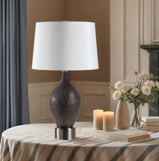 Apportez une touche de designer à votre intérieur en intégrant des éléments métalliques à votre décoration. Cette lampe de table vous y aide grâce à son pied en étain aux proportions généreuses, qui s'harmonise parfaitement avec un corps en verre peint à la main d'un brun profond. Un abat-jour en imitation soie blanc cassé complète l'ensemble et assure un éclairage optimal.
