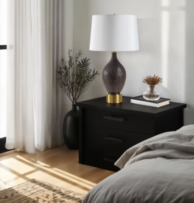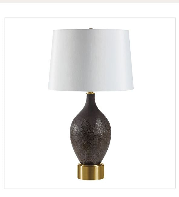 Apportez une touche de designer à votre intérieur en intégrant des éléments métalliques à votre décoration. Cette lampe de table vous y aide grâce à son pied généreux en laiton aux tons chauds, qui s'harmonise parfaitement avec un corps en verre peint à la main d'un brun profond. Un abat-jour en imitation soie blanc cassé complète l'ensemble et assure un éclairage optimal.
